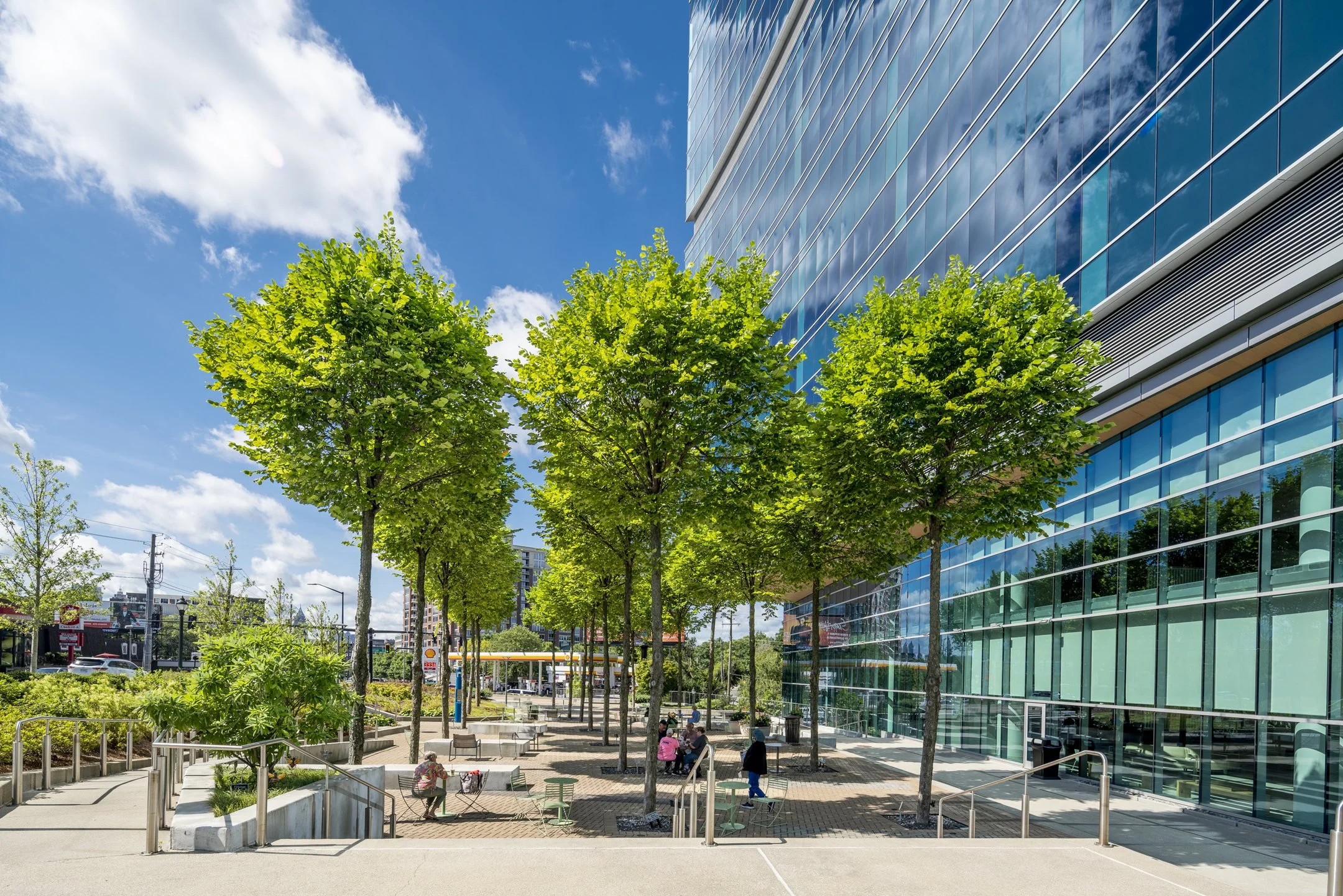 With our project, both Peachtree and the cross street, Collier Road, will have new broad sidewalks lined with shade trees, which will provide a pleasant walking experience along both arteries. A new multilevel plaza space will provide direct connectivity between the hospital lobby and the new expanded sidewalks. The plaza can also be enjoyed by the public or provide breakout space after lectures in the new auditorium. An active-use facility—think food venue—is proposed adjacent to the plaza, which will add life to the hospital street frontage. These additions will create a much stronger connection to Piedmont Hospital’s front door from Peachtree Street.