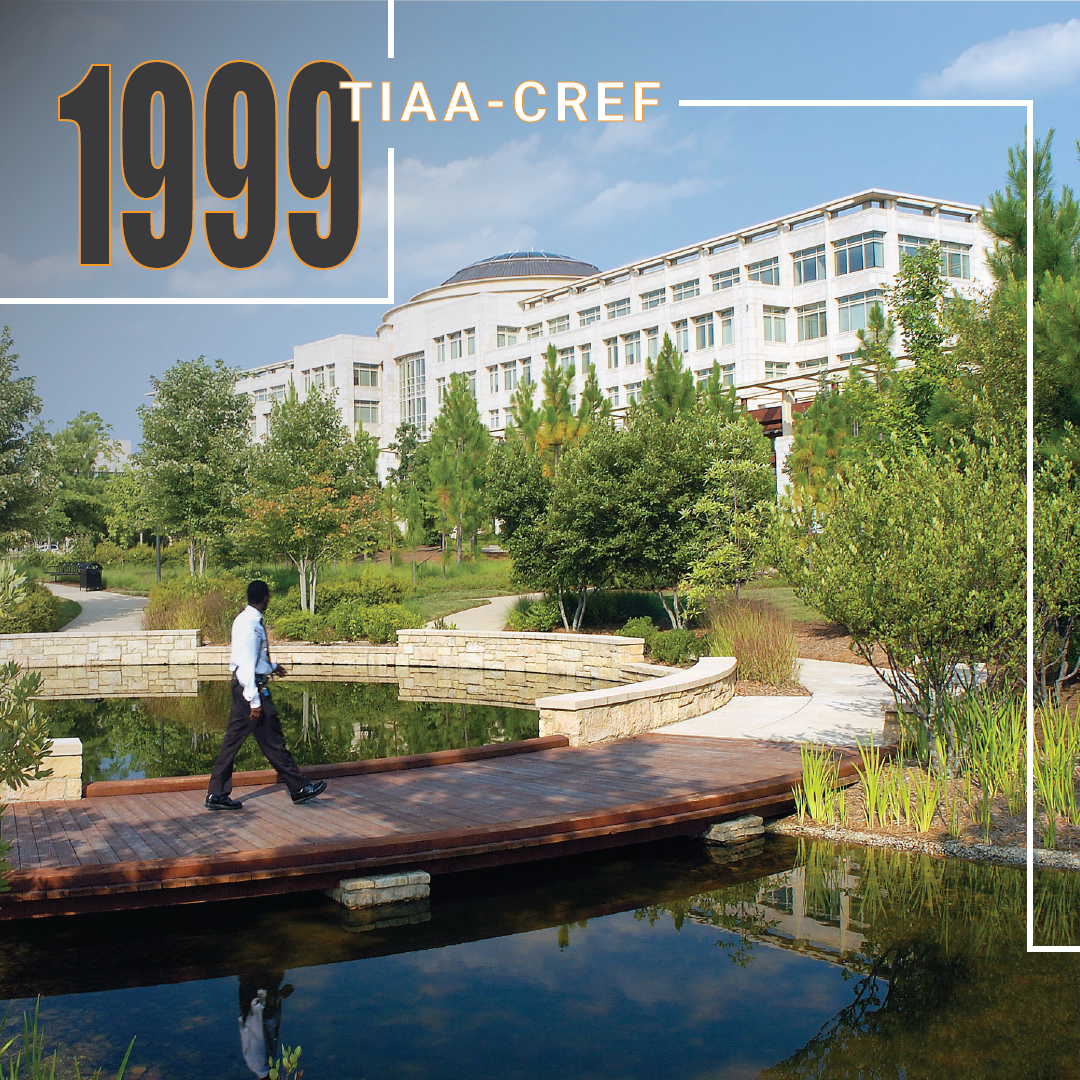 The 137-acre TIAA-CREF office site sits within the University Research Park of Charlotte, NC. With two million square feet of campus, the goals of the master plan were determined to plan in a matter that fit the land, have lasting value, capability to display a corporate art program, and have educational value.