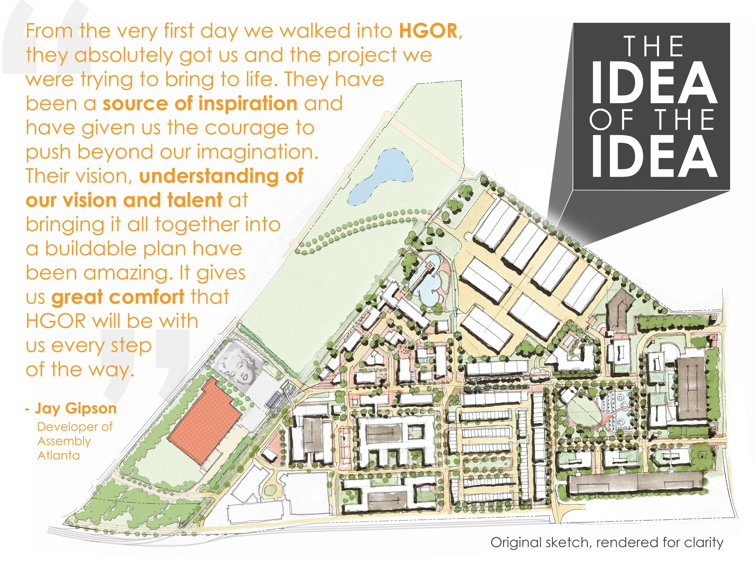 When Jay Gipson, Assembly Atlanta developer, shared his vision for a mixed-use development to create a vibrant community entertainment destination capitalizing on the booming film industry, Chris Mutter used his keen ability to listen and absorb the values rooted within the concept. Chris and his team sketched a design, immediately capturing the very essence of Jay’s vision–the “Idea of the Idea” served as the framework for the development.