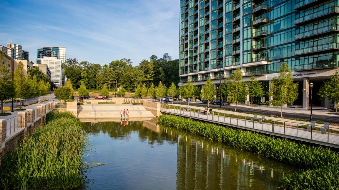 In addition to construction cost savings, a notable achievement for the City Place/Marie Sims Park efforts is that it increased property values, exponentially exceeding its pre-recession value, and became the highest-value property in the market at the time. The deeper thought process and stewardship of resources created an experience through a shared amenity, walkable connections to the MARTA Transit Station, and maximized views through open space, adding to the sense of place for the community.