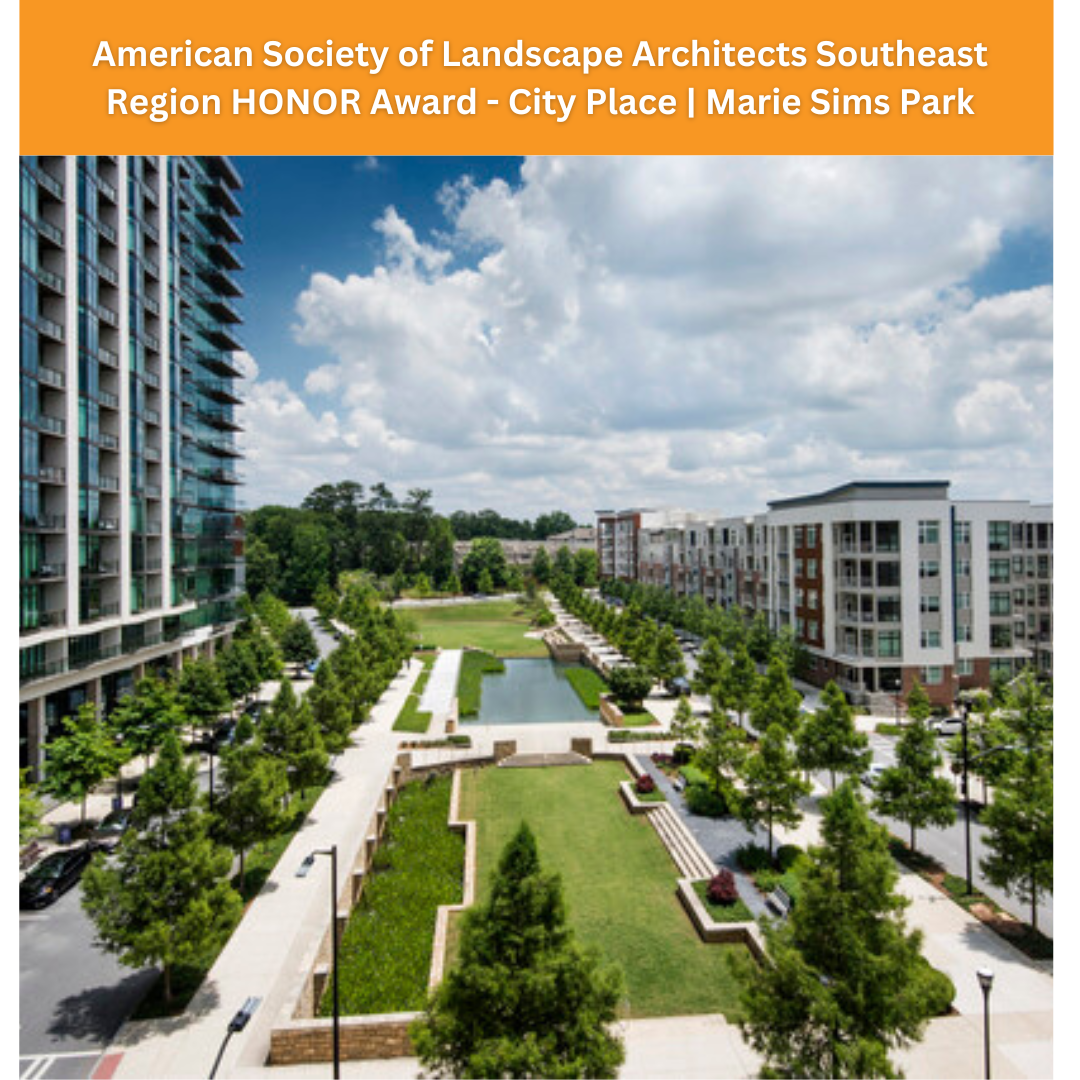 The April ASLA SE Regional Conference was the beginning of much excitement for our team. The CITY PLACE | MARIE SIMS PARK project received an Honor Award recognizing Principal Chris Mutter and his team for exceptional design innovation of a dual-purpose urban space catering to surrounding residents’ needs while providing centralized stormwater solutions within a park.